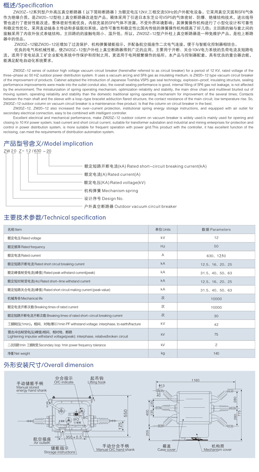 ZW20-12真空斷路器(帶隔離刀)