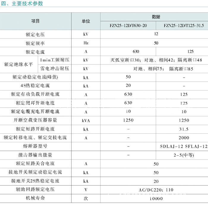 FZN25-12D/T125-31.5型交流高壓真空負(fù)荷開(kāi)關(guān)——熔斷器組合電器是三相交流50Hz,額定電壓12kV的戶內(nèi)裝置,適用于工礦、企業(yè)、配電所及變電站等場(chǎng)合,作負(fù)荷控制和短路保護(hù)之用。配裝的接地開(kāi)關(guān),可以承受短路電流。操作機(jī)構(gòu)可手動(dòng)和電動(dòng),便于實(shí)現(xiàn)電力系統(tǒng)的三遙控要求。
