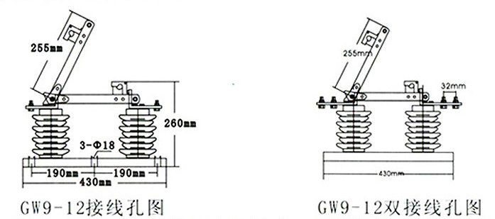 圖一GW9-12型隔離開關單、雙接線孔外型及安裝尺寸