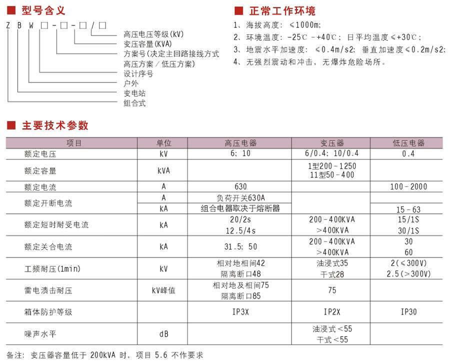 ZBW(N)型系列組合式變電站是將高壓電器設(shè)備、高壓器、低壓電器設(shè)備等組合成緊湊型成套配電裝置,用于城市高層建筑、城鄉(xiāng)建筑、居民小區(qū)、高新技術(shù)開發(fā)區(qū)、中小型工廠、礦山油田以及臨時(shí)工作用電等城所,作配電系統(tǒng)中接受和分配電能之用。